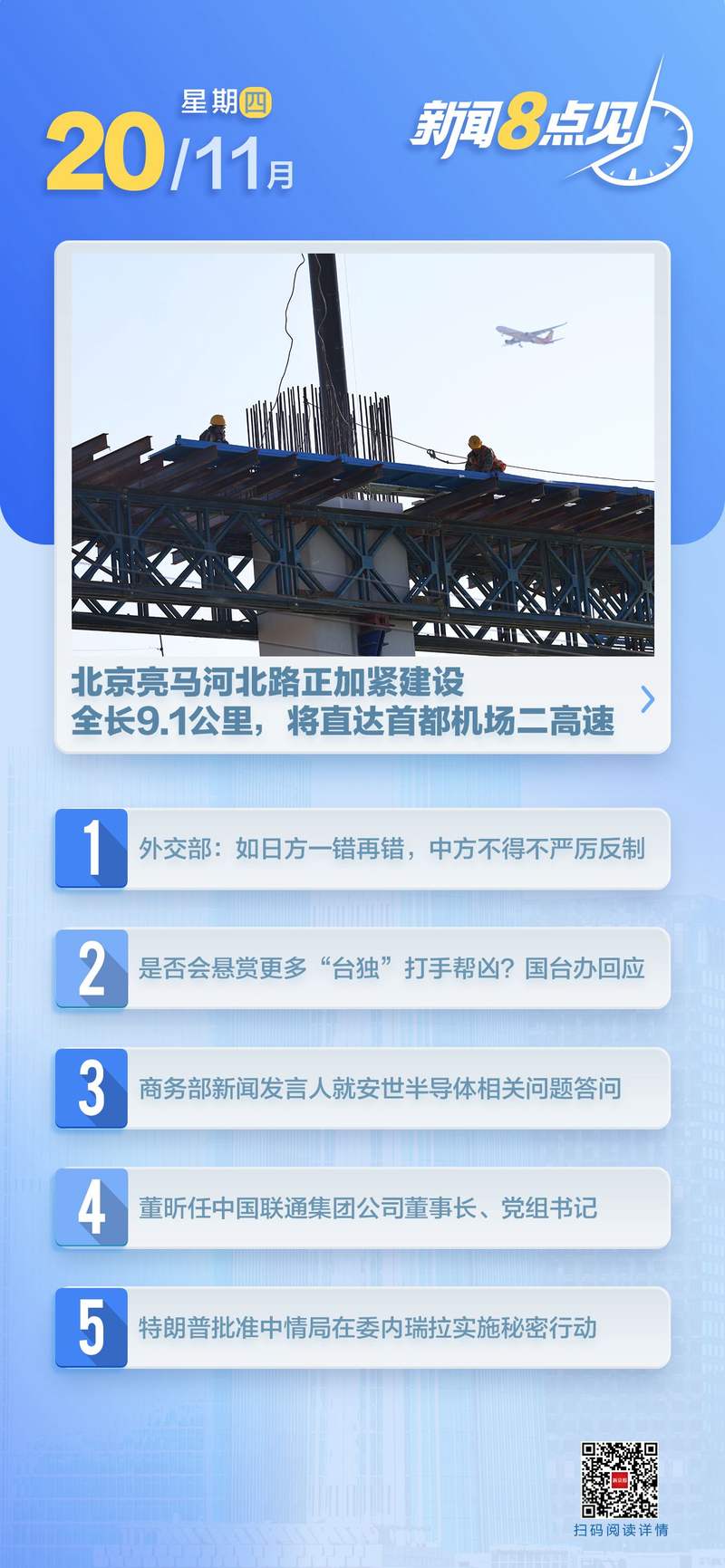【时政】外交部:如果日方拒绝收回涉台不实言论,日方将承担全部责任。外交部发言人毛宁19日在例行记者会上表示,日本首相高市早苗在台湾问题上的不实言论从根本上损害了中日关系的政治基础,引起中国人民的愤怒和谴责。如果日方拒不撤军或一再重蹈覆辙,中方将不得不采取强硬果断反制措施,由此产生的一切后果由日方承担。中方严正敦促日方收回不实言论,停止在涉华问题上挑起事端,承认错误,以实际行动纠正错误,维护中日关系的政治基础。 (新华社)阅读全文>>>中方是否暂停进口日本水产品?外交部 A外交部回应称,11月19日,外交部发言人毛宁主持例行记者会。记者提问:中方已通知日方暂停进口日本水产品。您能否介绍一下相关细节和原因?毛宁表示,据我了解,日本此前已承诺履行对华出口水产品的监管责任,确保产品质量安全。这是日本水产品出口到中国的必要条件。但日本目前并未提供承诺的技术材料。毛宁强调,日本首相高市早苗近期在台湾等重要问题上发表矛盾和错误言论,引起中国人民强烈民愤。长此以往,日本水产品即使出口到中国也将没有市场。 (央视新闻)雷阿全文>>> 今后是否会向更多“台独”暴徒和帮凶下发悬赏通知书?国台办对国台办新闻发言人朱凤莲表示,多年来,温子瑜、陈百元发表、散布“抗中保台”、“依美独立”等分裂主义煽动言论,轻率攻击诽谤大陆惠台利民政策,欺凌迫害台湾。以及台湾人在大陆的配偶。支持两岸关系和平发展的同胞,倒行逆施,搞“台独”,煽动邪恶,施加负面影响。公安机关已下发通知,对举报犯罪行为进行奖励。这是依法惩治分裂国家、煽动分裂国家罪的具体行动。这就是“确实这是响应两岸民众惩治台湾的呼声而采取的正当举措。悬赏通知所列激励措施,将由公安机关按照有关法律法规执行。朱凤莲强调,和平、发展、交流、合作是台湾的主流民意。“台独”的铁杆打手、托儿和一些坏苹果正在做坏事、做坏事。广大台湾民众对他的行为深恶痛绝、深恶痛绝。支持依法严惩全文>>>阅读全文 国台办:20日起,大陆可签发台胞单一证明的口岸将增至100个。商务部新闻发言人就安世半导体相关问题回答了记者提问。记者问:“近期中荷双方就Nexperia问题的谈判进展如何?”答:11月18日和19日,中荷两国政府部委在北京就安世半导体问题举行了两次面对面磋商。磋商中,中方重申荷兰对当前全球半导体供应链中断负有责任,呼吁荷方迅速有效推动Nexperia问题早日解决,采取切实措施恢复全球半导体供应链安全稳定。荷兰主动暂停d 荷兰经济部长根据《资产可用性法》发布的行政命令。中方欢迎荷方暂停执行该行政令,认为这是朝着妥善解决问题的正确方向迈出的一步。然而,“撤销行政命令”要解决全球半导体产业和供应链混乱和混乱的根源,还有很长的路要走。与此同时,在荷兰经济部的推动下,公司法院错误裁决剥夺闻泰科技对安世半导体的控制权,仍然是解决该问题的主要障碍。我们表明荷方将继续与中方真诚合作,真诚提出建设性解决问题的方案。我希望它能继续这样做。双方同意停止行政干预和支持,鼓励企业通过协商和立法解决内部纠纷。这不仅可以保护投资者的合法权益,也为恢复全球半导体产业和供应链的安全稳定创造更加有利的条件。 (商务部)阅读全文>>>>新的中央检查队已完全停放。 2025年11月19日,首次中央生态环境保护考察团进京考察调度会在京召开。目前,第三批、第五批10个核心生态环境保护督察组已全部部署到位。 (生态环境部)阅读全文>>>贪污贿赂数额巨大。新华保险原总裁全李一审被判处死刑,缓刑。 2025年11月19日,山东省济南市中级人民法院公开宣判原党委书记李全贪污受贿案一审判决重审、新华人寿保险股份有限公司董事长,以贪污罪判处被告人李泉无期徒刑。被判处死刑,剥夺政治权利终身,并处没收个人全部财产。因受贿罪,被判处死刑,缓期二年执行,剥夺政治权利终身,并处没收个人全部财产。决定执行死刑,缓期二年执行,剥夺政治权利终身,并处没收个人全部财产。全莉贪污追缴的登记资产将返还受害人单位,其余部分将继续追缴。全李先生受贿所得的资产和利息将依法上缴国库。经审理,发现其通过以下方式非法占有相关业务收入共计1.08亿余元。h 欺骗和隐瞒。他单独或者伙同他人非法收受财物共计1.05亿元以上。 (央视新闻)阅读全文>>>【当地】亮马河北路正在建设中,将直通首都机场二线。 11月19日,亮马河北路一处建筑工地,工人们正在施工。新京报记者 王桂斌 供图 随着岁末临近,北京不少道路建设项目正在加速建设。记者从第一发展集团公关公司获悉,北京市重大工程亮马河北路建设也在加紧进行。项目西起东四环,东至首都机场二线。全长9.1公里。东五环与首都机场二高速有立交,形成密集的区域公路网络。 (新京报)阅读全文>>>2026年高考首次听力和英语口语考试即将在北京拉开帷幕。北京市教育考试局11月19日发布消息,2026年高考第一次英语听说考试将于2025年12月13日举行,考生凭《准考证》和身份证在指定时间、地点参加考试,成绩将于2026年1月7日出炉。(新京报)阅读全文>>>【社会】一女子被三亚警方拘留。反复尾随顾客并使用辱骂性语言以获得拍照机会的行为。 11月18日,海南省三亚市警方发布报警。近日,有网友陈某举报称,她